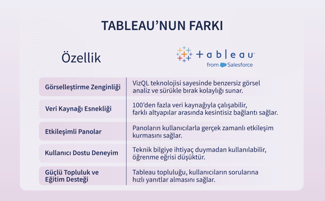 Tableau, veri odaklı bir yaklaşımla işletmelerin stratejik kararlar almasını kolaylaştıran, güçlü ve esnek bir platform sunar. Sektör fark etmeksizin, karmaşık verileri anlamlandırma ve analiz etme konularında sağladığı avantajlar sayesinde Tableau, modern iş dünyasında rekabetçi kalmak isteyenler için ideal bir çözümdür. Verilerinizi daha etkin kullanmak ve işinizde gerçek bir dönüşüm sağlamak için Tableau’nun sunduğu imkanları keşfetmeye başlayın.